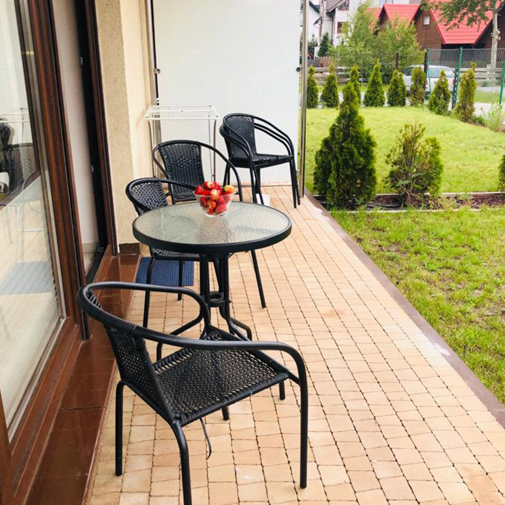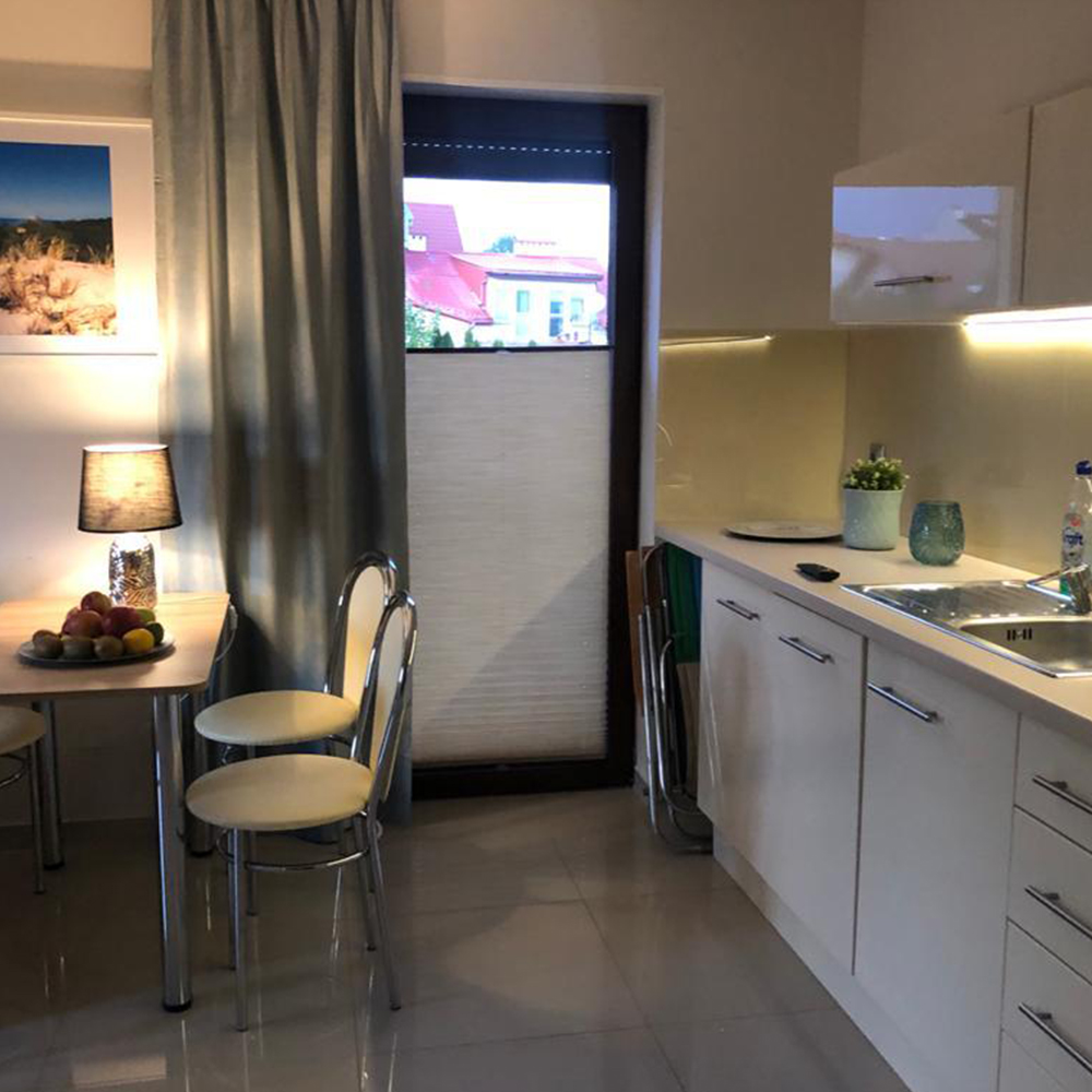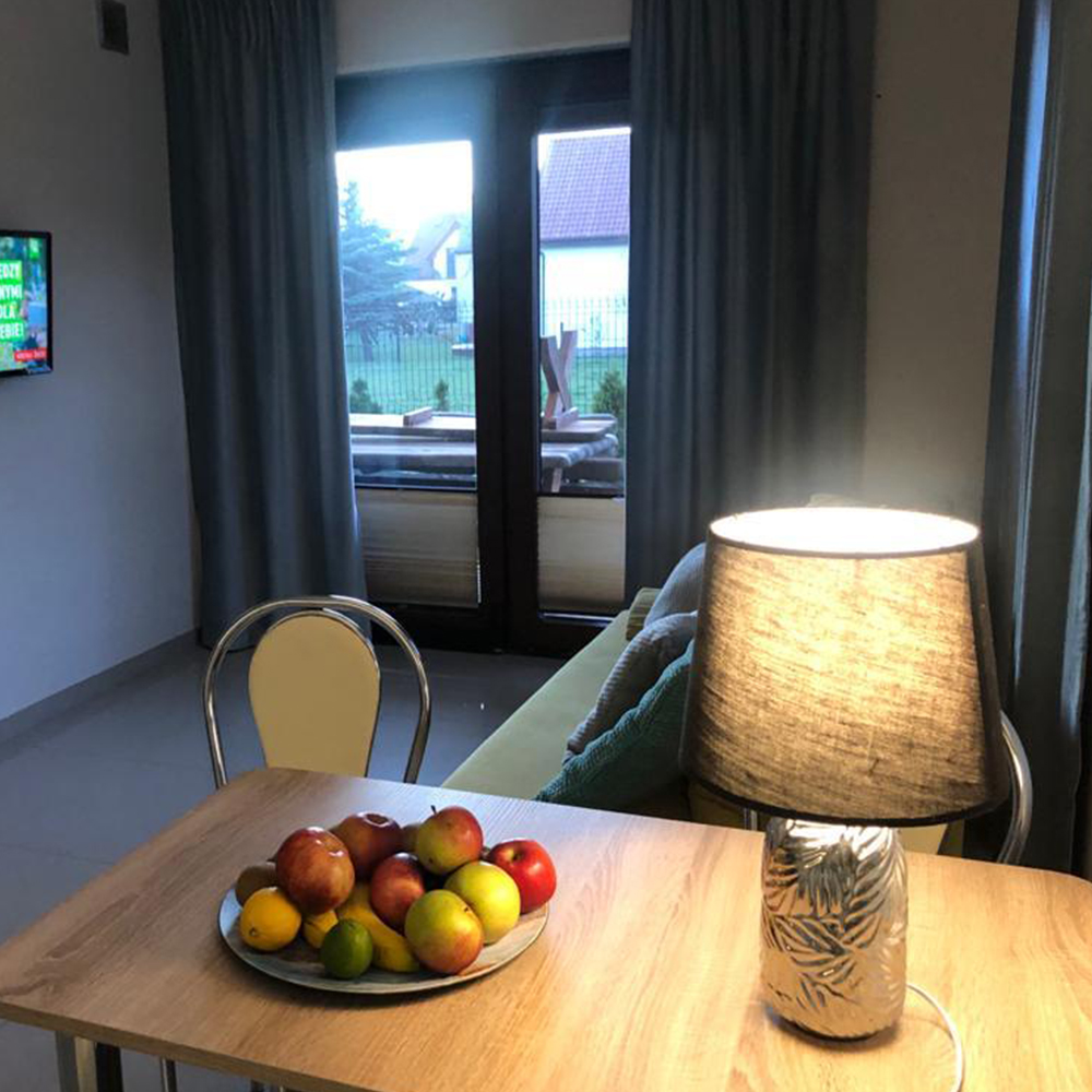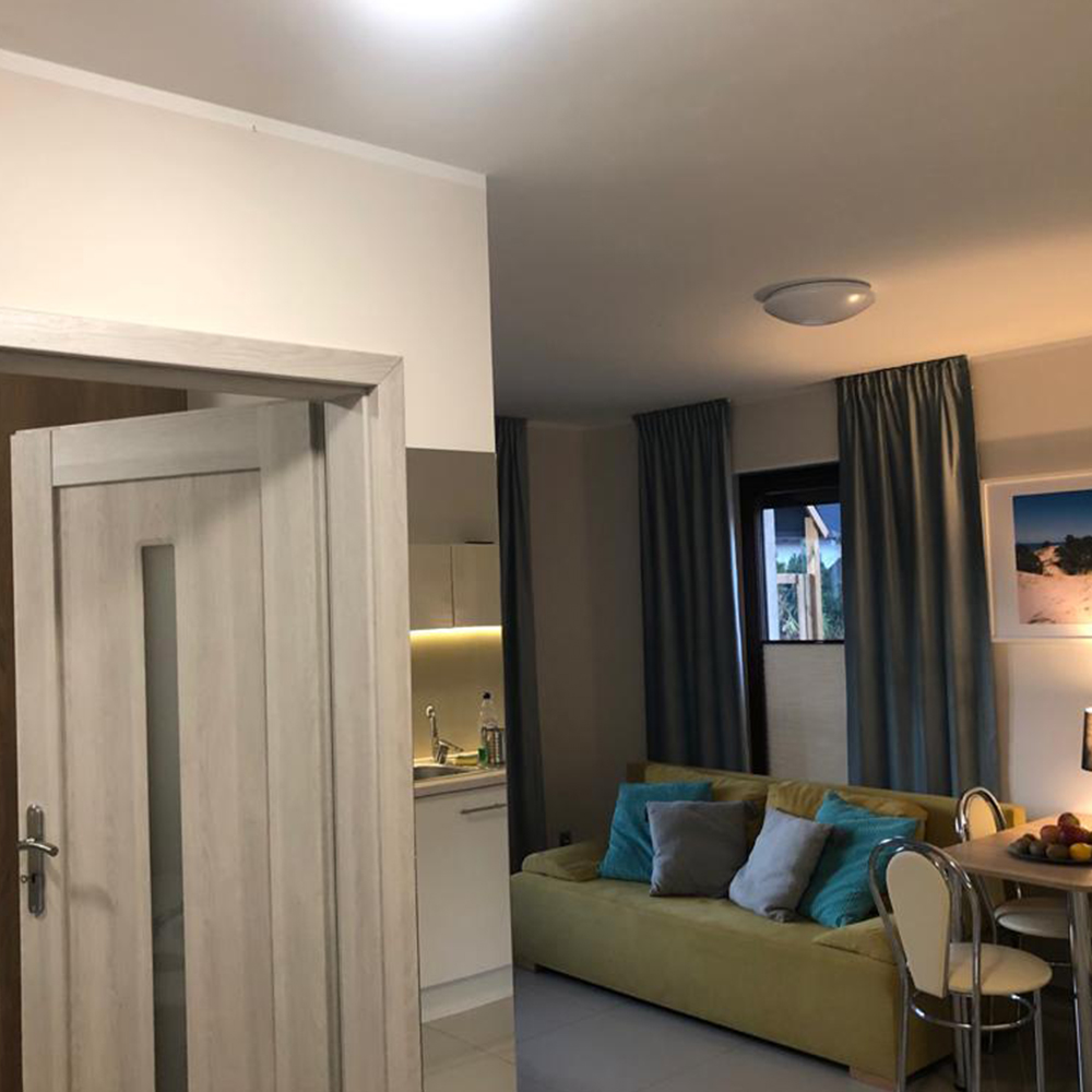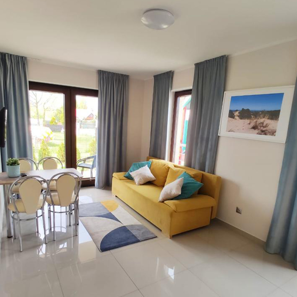 Piękna przestrzeń do wypoczynku urządzona z myślą o rodzinnych wakacjach lub wyjeździe we dwoje. Wygodna kanapa, przytulne wnętrze i niezbędne wyposażenie. Czteroosobowy apartament na parterze składający się z salonu z aneksem kuchennym i sypialni z dużym, dwuosobowym łóżkiem. Z myślą o komfortowym śnie i wygodzie gości apartament jest wyposażony w wysokiej jakości pościel i ręczniki. Z apartamentu jest wyjście do ogródka, który zadowoli wielbicieli relaksu na świeżym powietrzu.